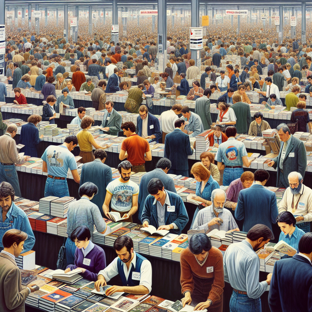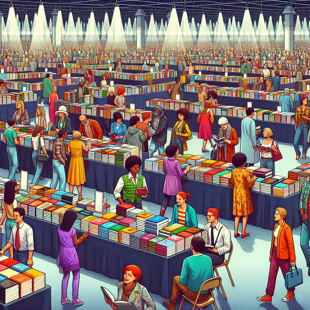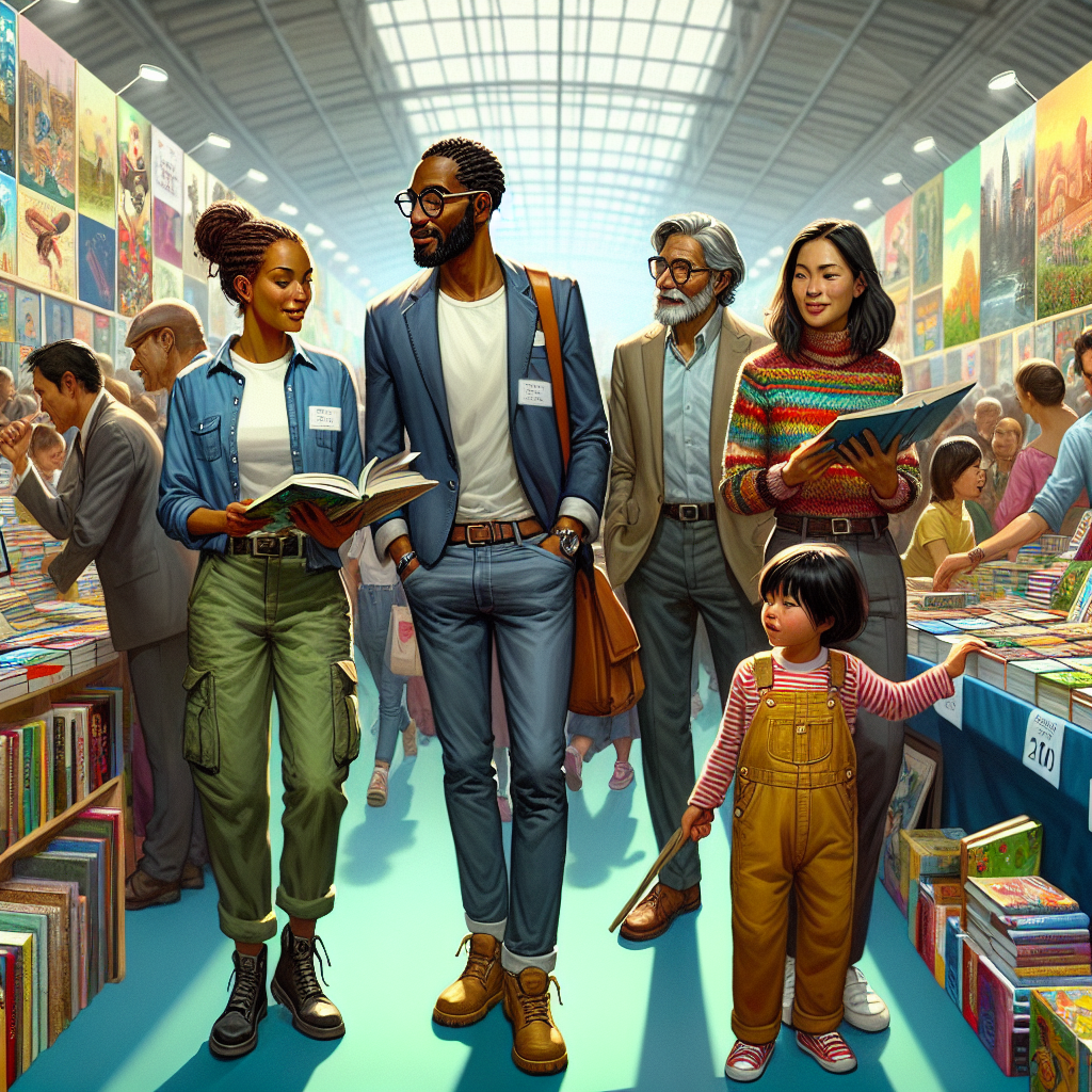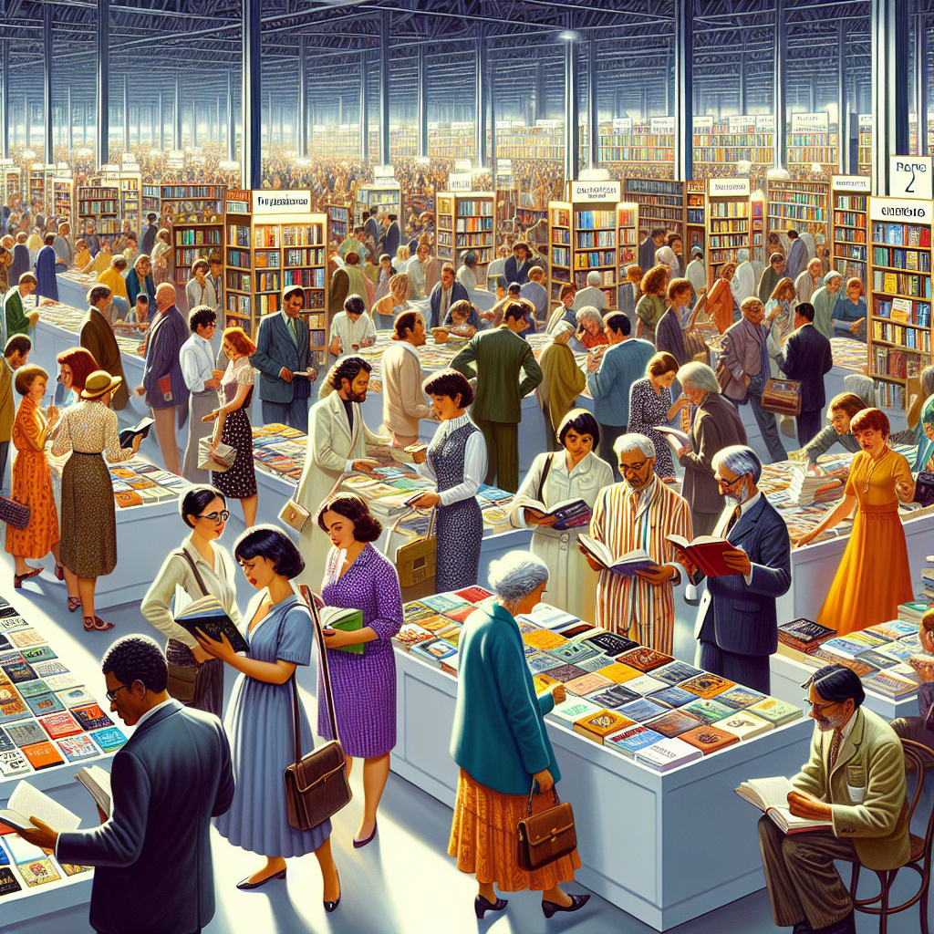 Publishers have historically participated in book fairs and direct sales events. These gatherings were crucial for promoting new titles. Can you give me an image of people attending a book fair. It should be colourful, and well lit so everything is visible.The book fair is happening in the year 2000 so make sure the clothes people are wearing is the appropriate style for that year.