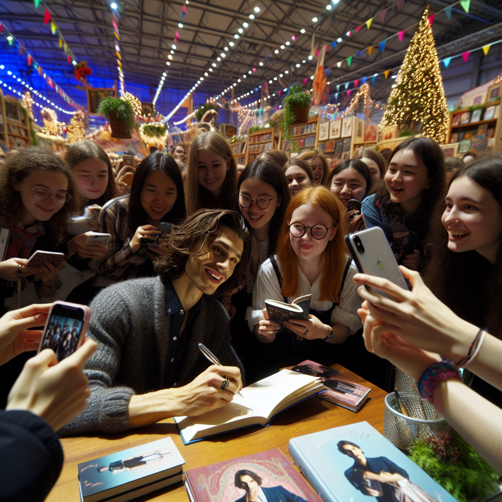 An engaging scene of a contemporary author engaging directly with fans, signing books and taking selfies at a book fair.
