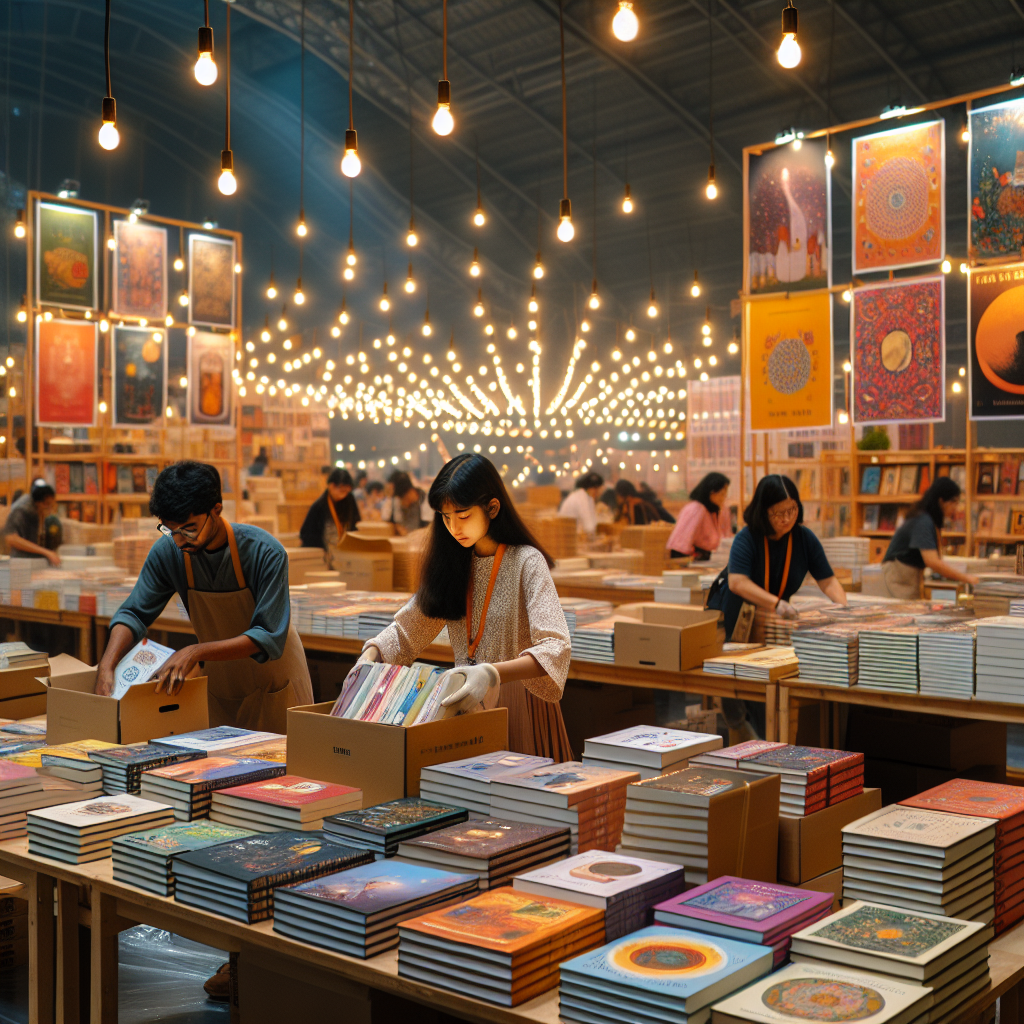 A serene scene of an early morning setting up at a book fair, with workers unboxing books and setting up displays under warm lighting.